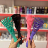 برس فلکسی این برس مناسب باز کردن گره ی موهای فر ریز فردرشت موج دار و انواع مو فر است - جنس دندانه پلاستیک منعطف - خیلی محکم وخوش دست است - هشت ردیف باریک دارد که با یک نوار به هم متصل میشوند و میتوانید از این نوار استفاده کنید یا میتونید نوار رو بردارید - این برس یکی از محبوب ترین برس ها بین موفرفری هاست چون مو ها را نمیکشد و خیلی راحت ونوازشی گره های سخت مو ها را باز میکند - این برس را میتوانید تنظیم کنید اگر موهای پر و کوتاهی دارید نوار پشتی برس را بالا تنظیم کنید و اگر موهای بلند و ضخیمی دارید نوار را پایین تنظیم کنید - نواری که روی شانه قفل شده از قسمت پشت شانه دو محل دارد که برای تنظیم است